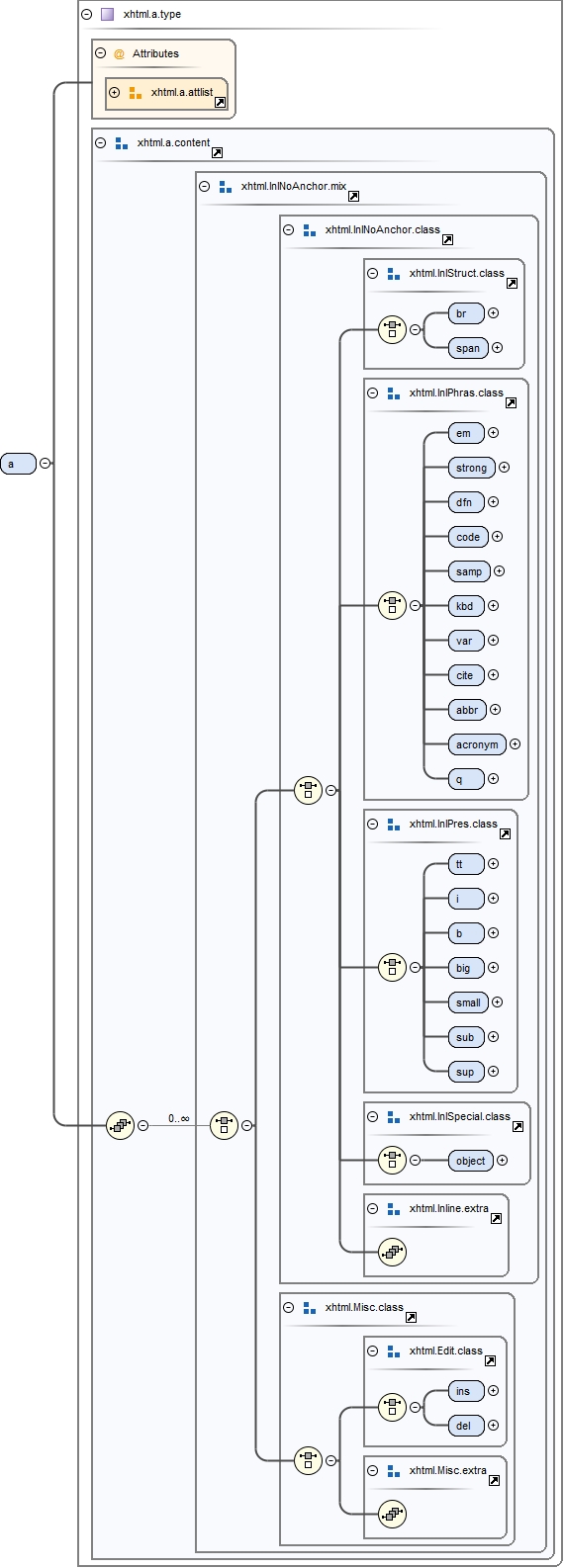 Hypertext Module This is the XML Schema Hypertext module for XHTML * aThis module declares the anchor ('a') element type, which defines the source of ahypertext link. The destination (or link 'target') is identified via its 'id' attributerather than the 'name' attribute as was used in HTML. $Id: xhtml-hypertext-1.xsd,v 1.42005/09/26 23:37:47 ahby Exp $