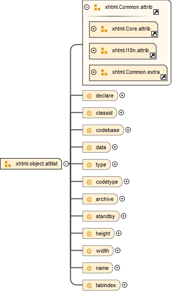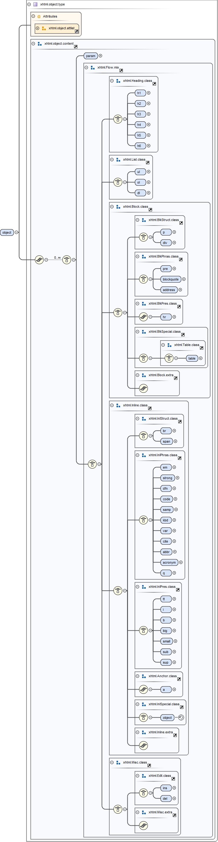 This module declares the object element type and its attributes, used toembed external objects as part of XHTML pages. In the document, place param elementsprior to the object elements that require their content. Note that use of this modulerequires instantiation of the Param Element Module prior to this module. Elementsdefined here: * object (param)