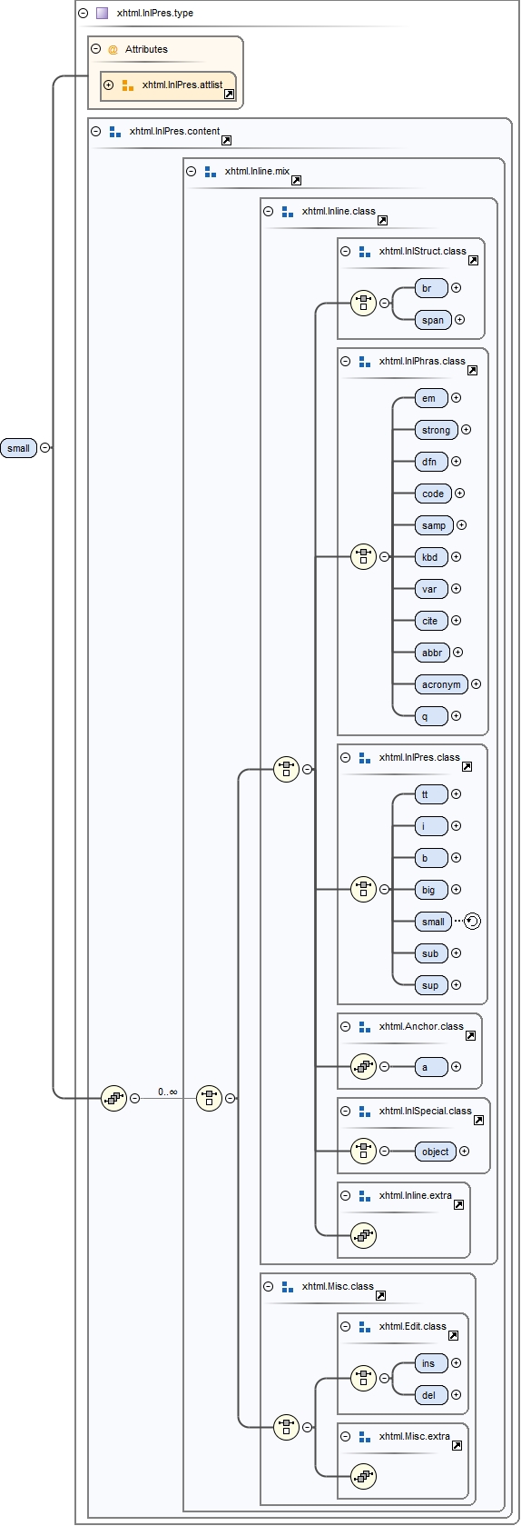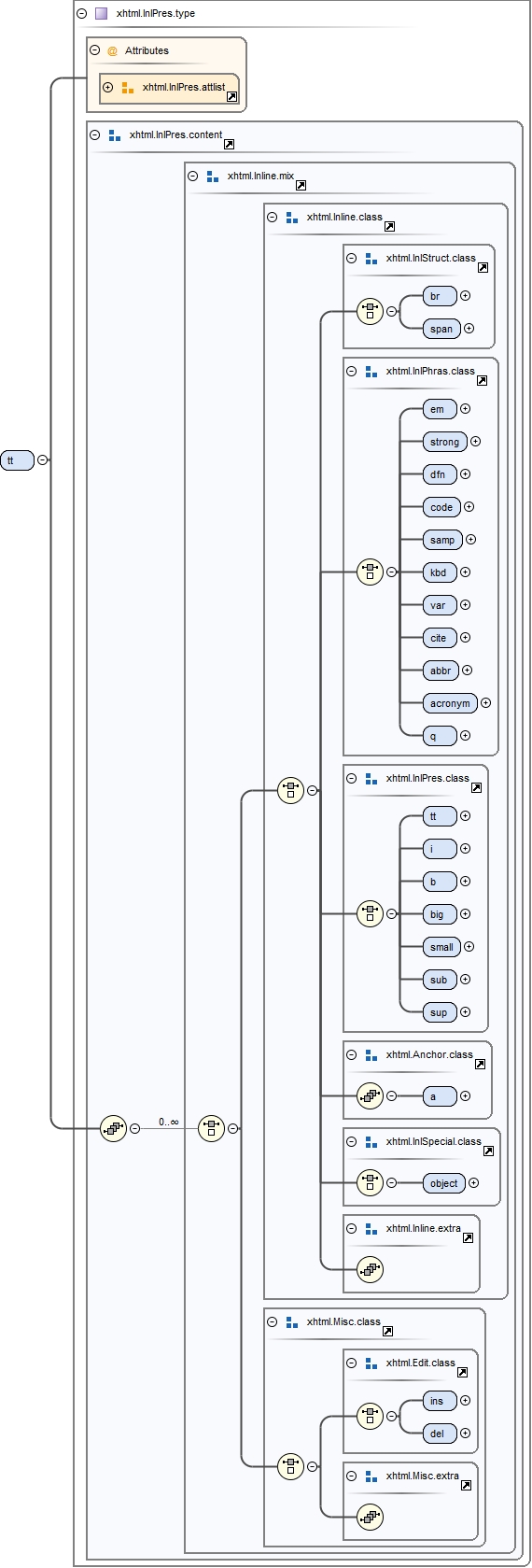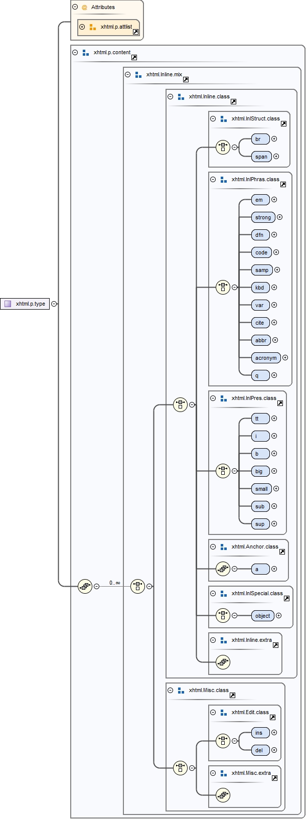 Textual Content This is the XML Schema Text module for XHTML The Textmodule includes declarations for all core text container elements and their attributes.+ block phrasal + block structural + inline phrasal + inline structural $Id:xhtml-text-1.xsd,v 1.2 2005/09/26 22:54:53 ahby Exp $